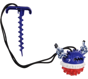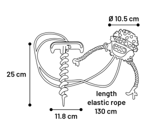 Varustatud elastse köie ja maasse kinnitatava vaiaga, mis hoiab mänguasja kindlalt paigal.