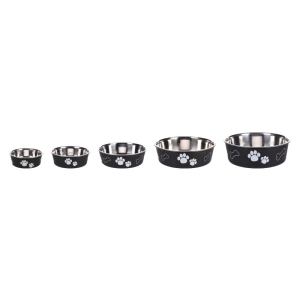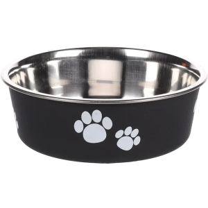 Materjal: roostevaba teras. Värvus: must valgete käpajälgedega. Kuju: ümmargune. Mõõdud: 14x5x12cm. Mahutavus: 450ml. Võib pesta nõudepesumasinas. Libisemisvastase põhjaga.