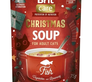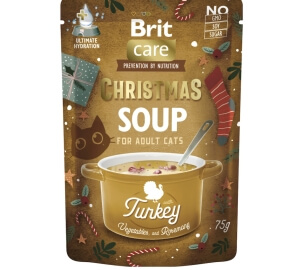 Brit Care jõulusupid - teraviljavaba märg täiendsööt kassidele. Multipakk sisaldab kolme erinevat sorti suppi: 5 tk kalaga, 5 tk kalkuniga ja 5 tk veisega.