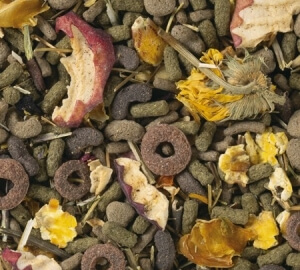 Teraviljad (sh mais), puuviljad (kuivatatud õun graanulis 15%, kuivatatud õun 3%, kuivatatud banaan), taimse päritoluga saadused (sh lutsernigraanul 5%, münt, kummel, petersellilehed, saialilleõis), köögiviljad (kuivatatud peet 2%, kuivatatud porgand 2%), seemned (sh linaseemned graanulis 1,5%), mineraalained.